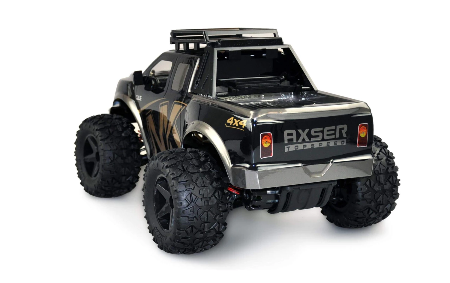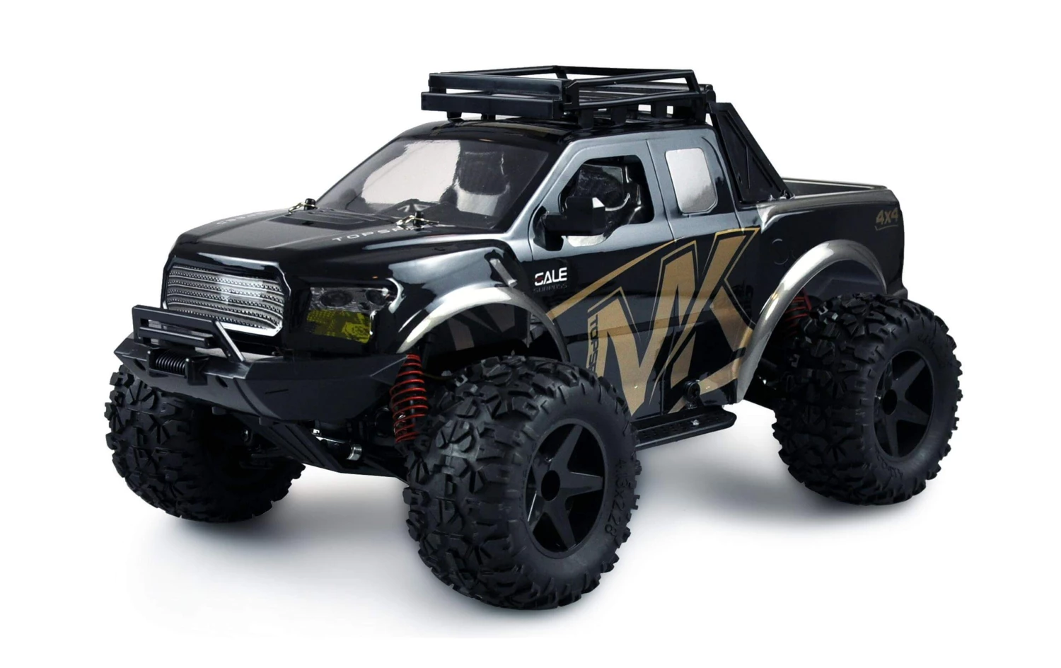Fahrzeugtyp: Monster Truck, Antrieb: 4×4, Antriebsart: Elektro Brushed, Modellausführung: RTR (Ready to Run), Benötigt zur Fertigstellung: Batterien für Sender, Detailfarbe: Gold, Schwarz